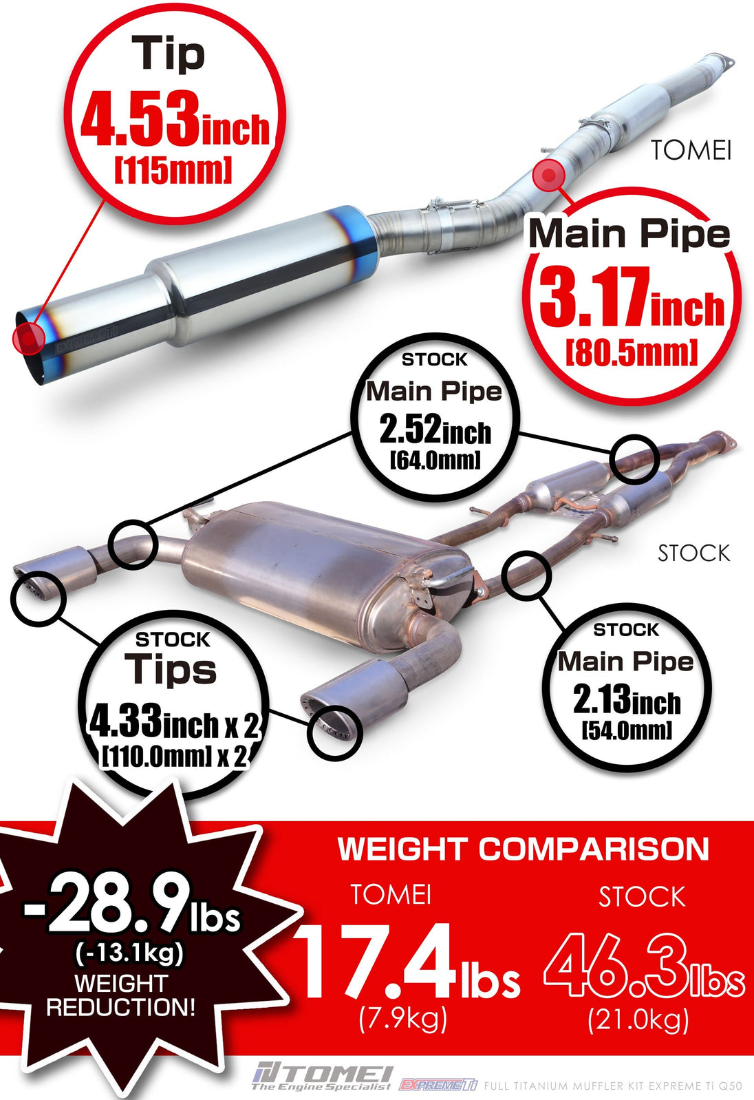 Unlike most exhaust systems that focus only on maximum peak power, Tomei's main priority was for overall engine performance gains. Every tube's length and size were carefully picked to suit each engine's characteristics and chassis to maximize torque, response and exhaust flow efficiency from start to finish. The use of Titanium materials with the single piping layout reduce the overall weight from approx. 46.3 pounds to an ultra-low 17.4 pounds.